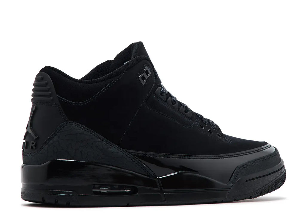 The 2025 version of the Air Jordan 3 Retro 'Black Cat' was named after one of Michael Jordan's pre-NBA nicknames. Sporting black nubuck on the upper, these shoes have a matching black patent leather mudguard and charcoal elephant-print forefoot and heel overlays. The Jumpman logo graces the tongue and back tab, while a foam midsole contains a visible Air-sole heel unit for a resilient feel.