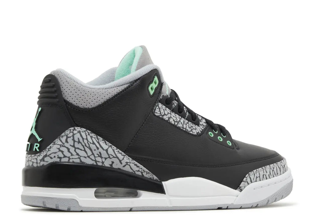 The Air Jordan 3 Retro ‘Green Glow’ throws a splash of color into a design inspired by the OG ‘Black Cement’ colorway. These shoes have a black leather upper with elephant print overlays on the eyestay, toe cap and heel. Green pops on the upper and lower eyelets add a touch of contrast, coupled with a raised Jumpman logo on the back tab. A soft midsole pairs with an Air-sole heel unit for a lightweight feel.