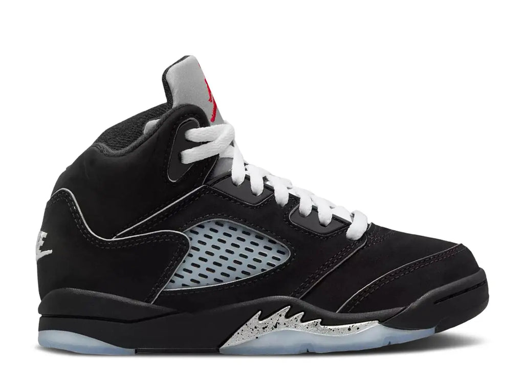 The Air Jordan 5 Retro OG PS 'Black Metallic Reimagined' is crafted from black nubuck, using reflective piping throughout. The customary quarter panel netting meets a padded collar as two of the key elements. A reflective finish embellishes the Jumpman-branded tongue, while the heel gets a Nike Air logo. These kicks have a black foam midsole, accented with metallic silver sharktooth details and bolstered by a rubber outsole.