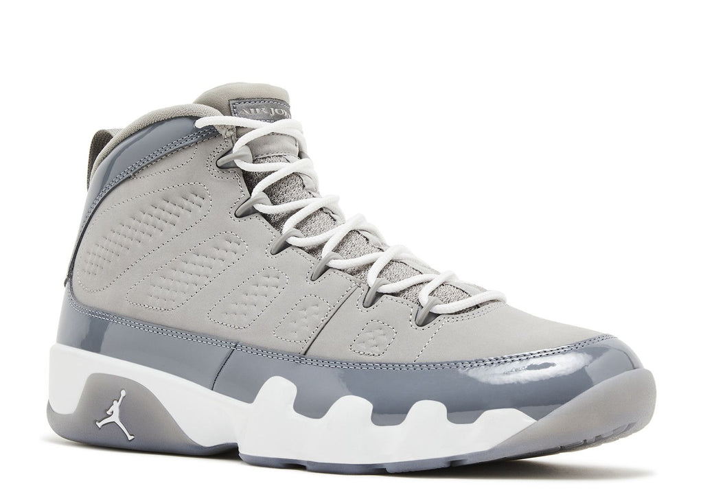Bringing back the original 2002 release, the Air Jordan 9 Retro 'Cool Grey' exhibits a grey nubuck upper with a matching patent leather overlay. The Air Jordan tongue label and iconic '23' stamped on the heel maintain the signature look. These shoes have a white foam midsole with encapsulated Air-sole technology in the forefoot and heel. The grey rubber outsole has multilingual touches, a nod to Michael Jordan's influence as a global icon.