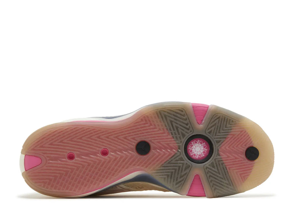 The Air Jordan 38 Low 'New Beginning' pays tribute to the feeling of starting anew with the start of the NBA season. The milk-colored, synthetic leather upper gets knit accents on the side panels. Pastel pink laces match the embroidered details on the midfoot, heel and collar, while hyper pink knit lines the tongue. The midsole packs a full-length Zoom Strobel unit and a stabilizing X-plate that engulfs the sidewalls.
