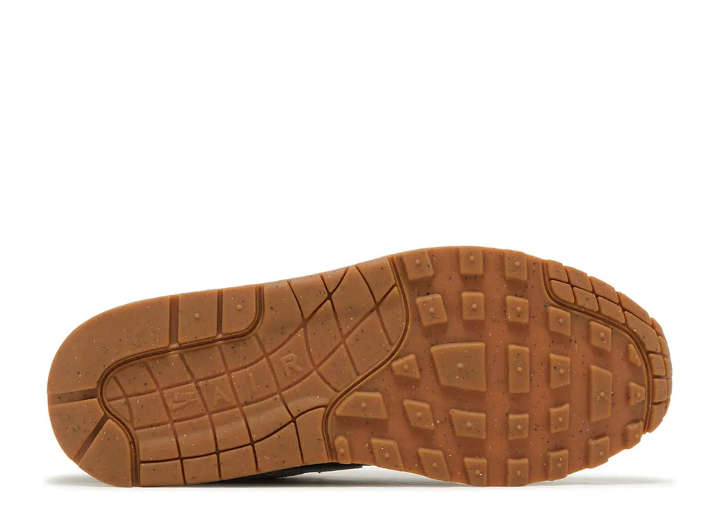 The Nike Women’s Air Max 1 QS ‘Letterman Pack’ rocks an obsidian nylon upper with navy suede overlays and a green leather mudguard. A white leather Swoosh on the side joins a purple mini-Swoosh and a matching Nike wordmark embroidered on the heel. These kicks have a white foam midsole with an Air-sole heel unit, all undergirded by a gum rubber outsole.