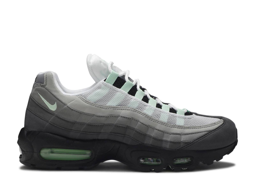 The Air Max 95 'Fresh Mint' emerges with a neutral colorway on its classic running construction. The shoe's suede upper includes a gradient fade on its layered build that transitions from grey to black, while Fresh Mint accents appear on the eyelets and lining. Underfoot, a black foam midsole houses visible Air cushioning in the forefoot and heel, with more Fresh Mint on the latter element.