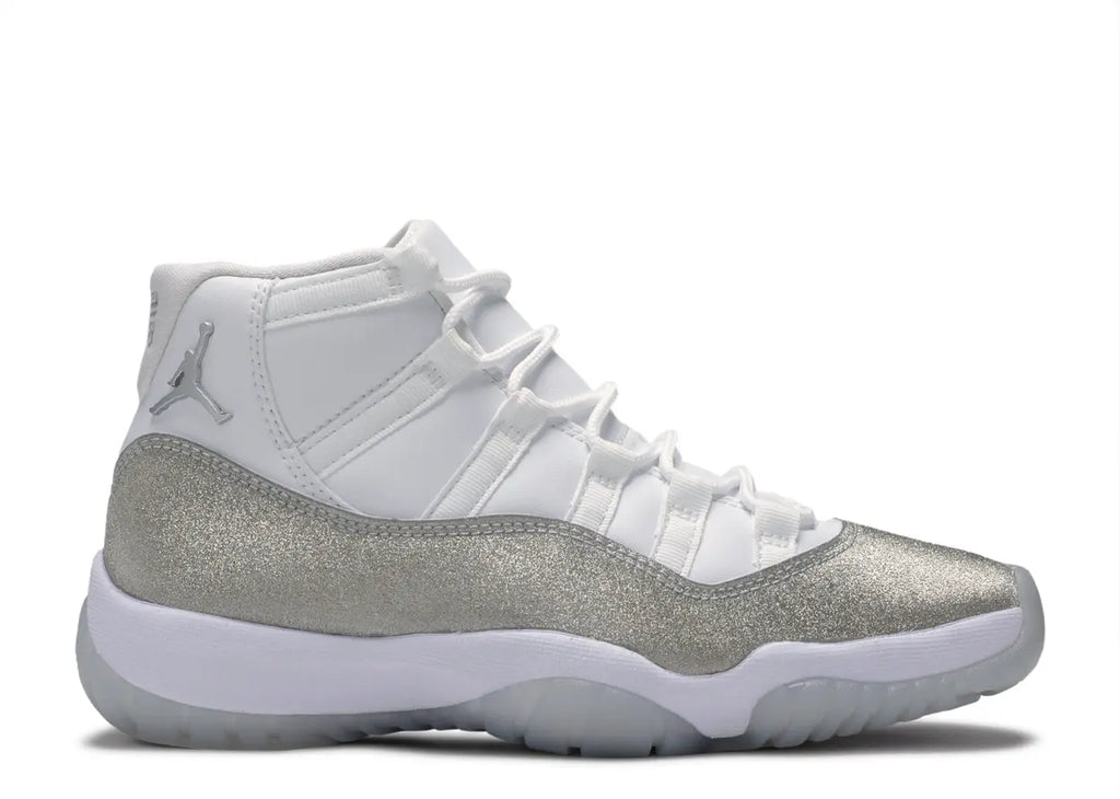 The women’s Air Jordan 11 Retro 'Vast Grey' swaps out the silhouette’s traditional patent leather overlay in favor of a glittery metallic silver finish. The rest of the upper is constructed from white leather, complete with matching white nylon lace loops and a metallic silver Jumpman on the lateral collar. A translucent rubber outsole delivers grippy traction underfoot.